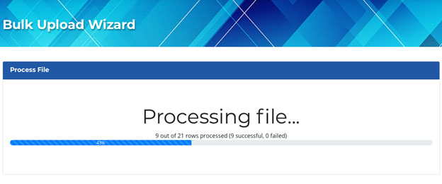 Now, we’re ready to process your file based on the information we’ve collected so far. You should see a progress bar and message letting you know the status of your import. Depending on how many rows of data and products in your import file, along with if you included one or more image URLs, this process could take some time. Don’t worry, if you happen to close your browser, the import will continue. If this happens, you can always go back to your “My Bulk Uploads” page, find this bulk upload and click Actions -> Continue to resume.