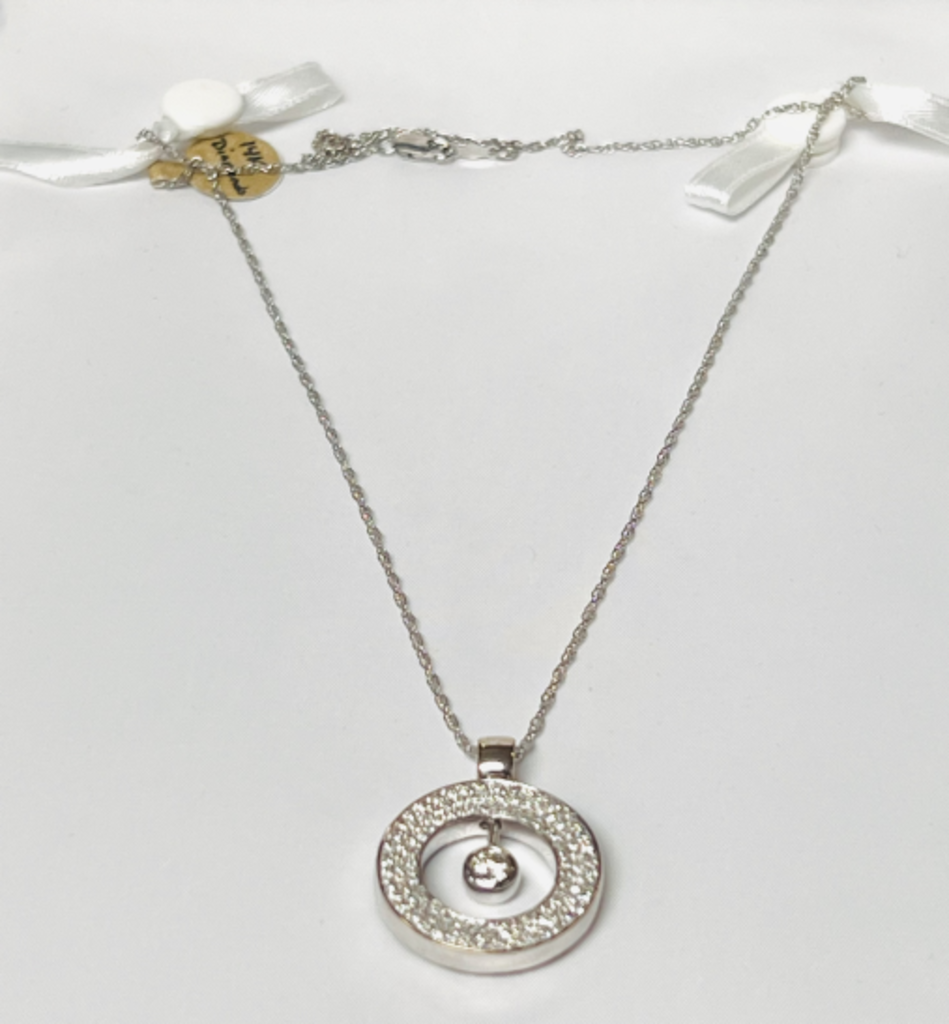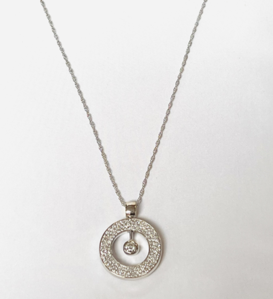 Round diamond pendant with articulated center for eternity, wholeness, and endless love.
