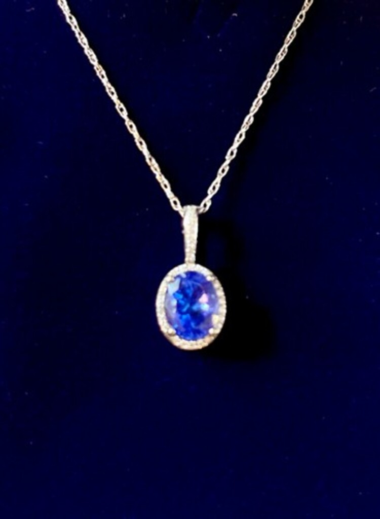 Beautiful 1.5-Carat Bright Intense Color Tanzanite (Natural Gemstone). The stone is surrounded by brilliant diamonds, all set in solid 14k white gold.