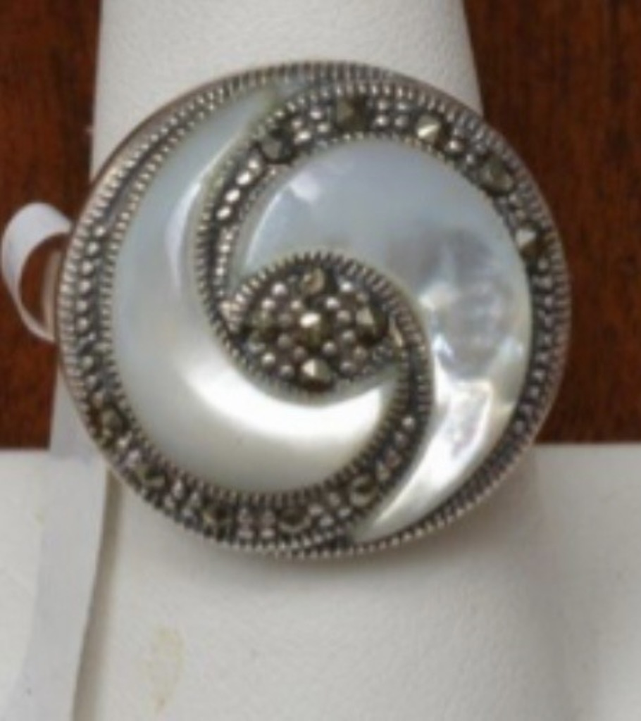 925 sterling silver Marcasite and mother of pearl Swoosh swirl ring. Size 7. Unique design with a mother-of-pearl swish accented by detailed market site all on a 925 Sterling silver setting.