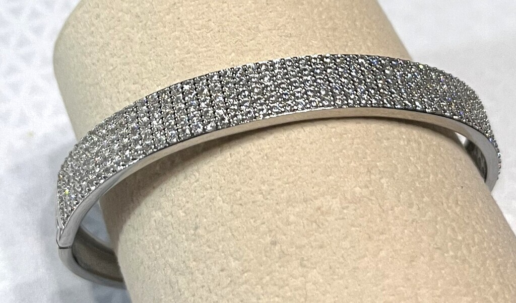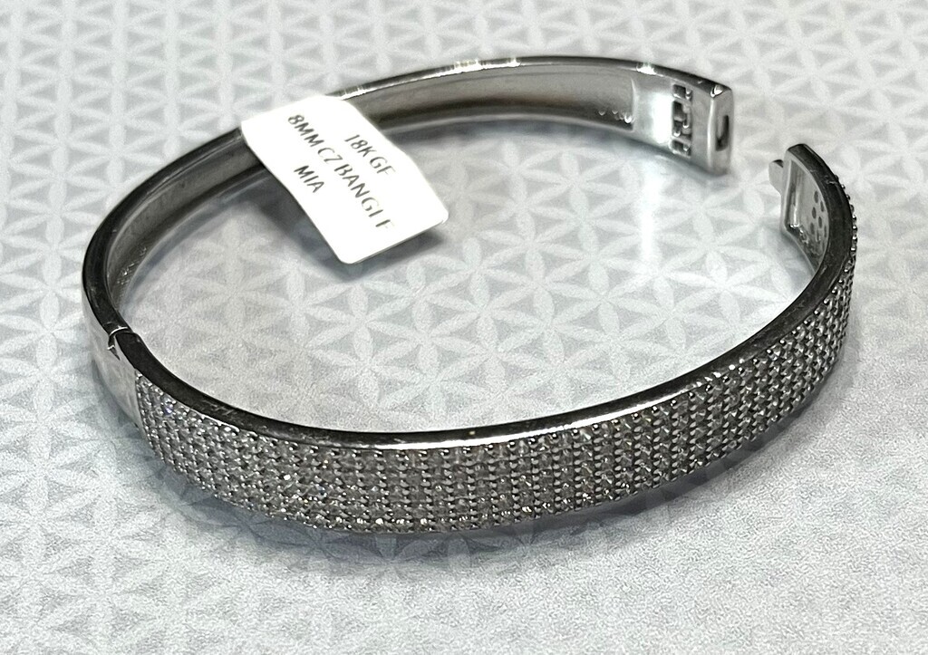 18Kt White Gold-Filled Bangle Bracelet with CZ"s Pave Set across the entire top of the bracelet.