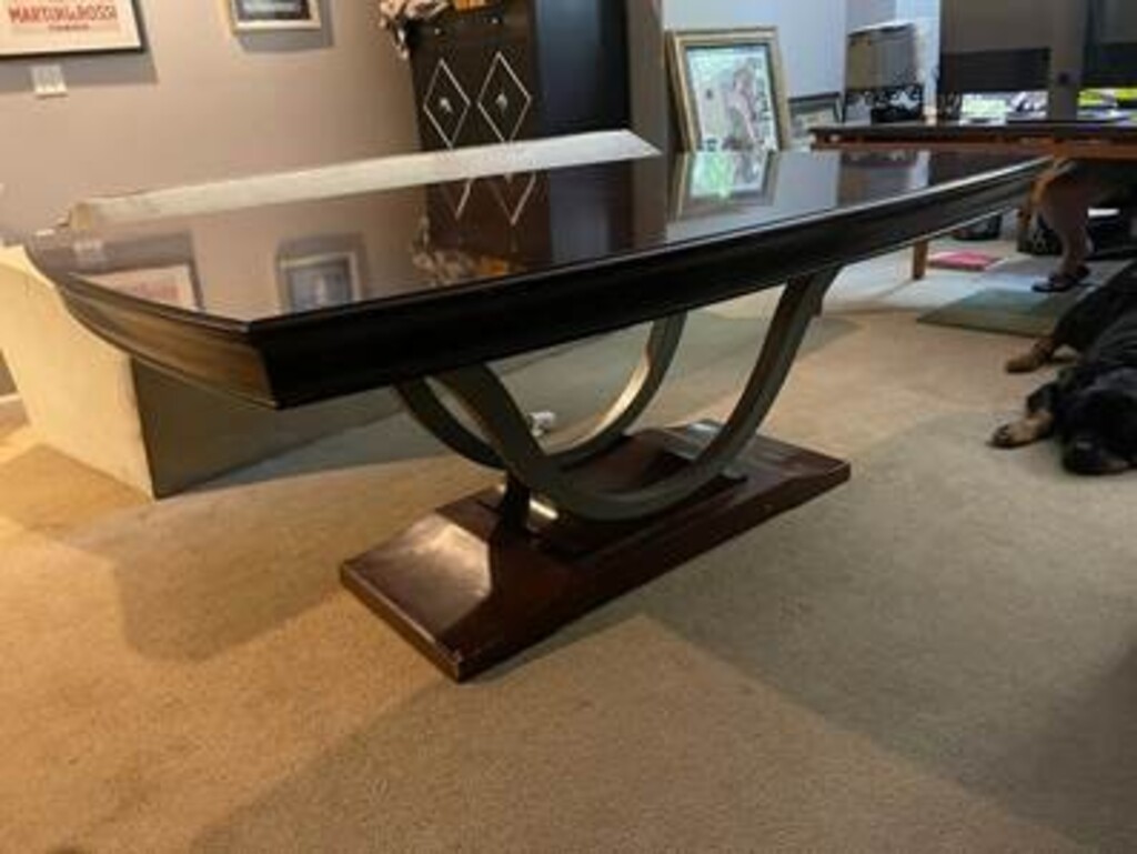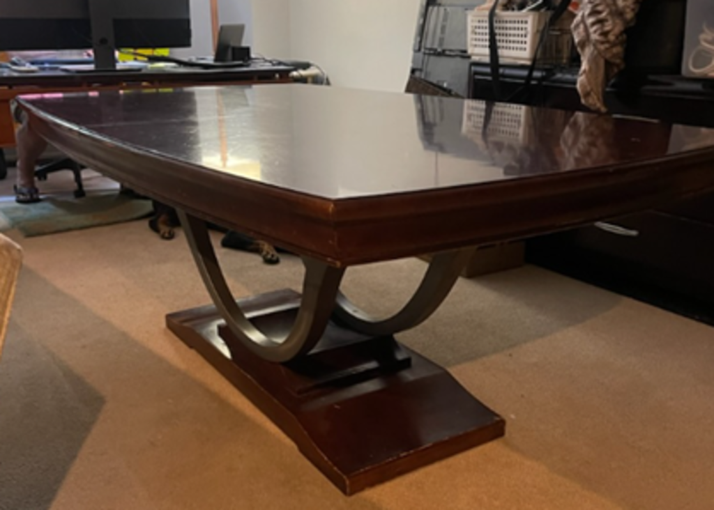 This is a Bernhardt dining room table it comes with two leaves so it can sit up to 12 people. 76" L X 45" W in fair condition. If it was refinished it would be absolutely gorgeous. Comes with leaves covers. I believe they're 18 inches making the table an extra 3 feet long.