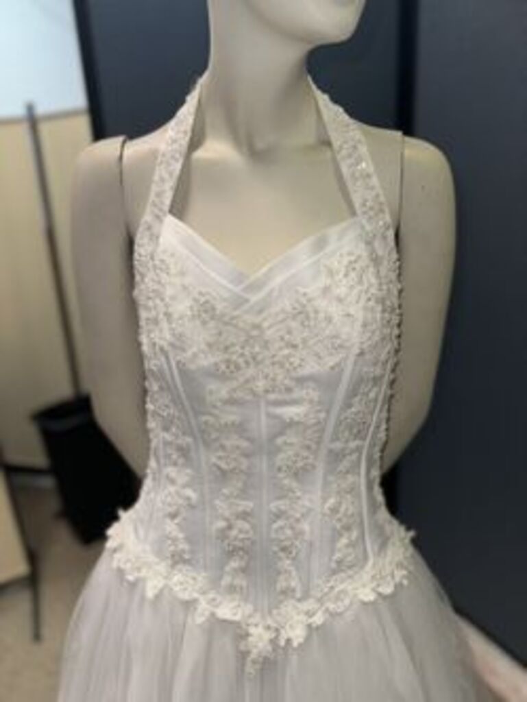 David’s Bridal #2295E Beaded bodice and neckline , zip up back with buttoned details with rose bow draping over train. Size 12, no known alterations.