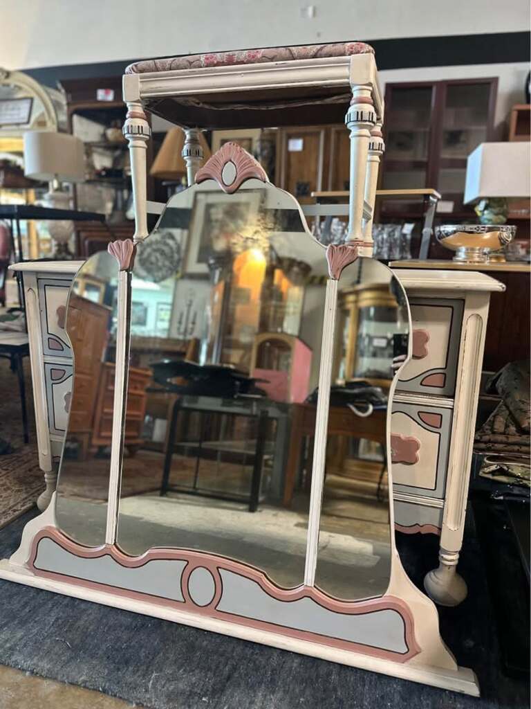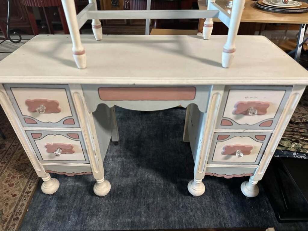 Shabby chic vanity with stool, desk, and matching mirror. Cream, pink and light blue in color with crystal hardware