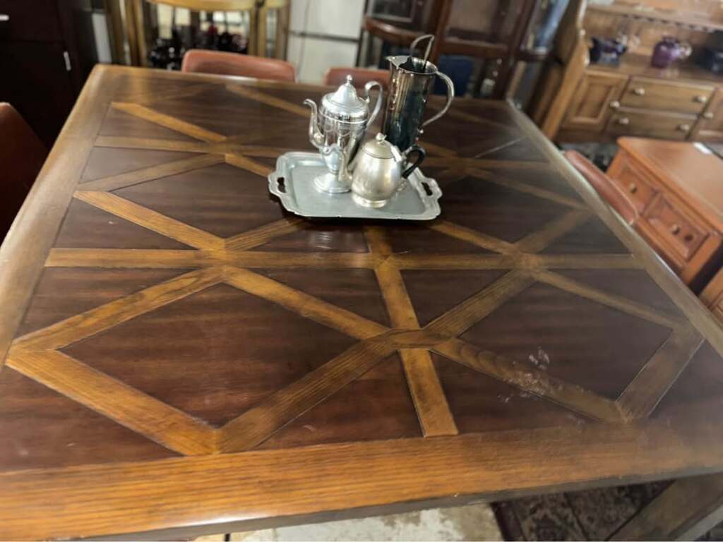 Tall dining table with 5 leather chairs, beautiful diamond top design with brass like hardware.