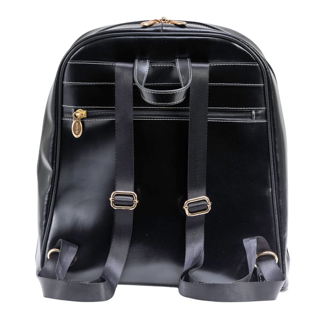 Front pocket with clasp turn closure. Belt design on front pocket. Two front zipper pockets. Main compartment with wide opening, ability to unzip all the way down on each side. Interior laptop pocket and tablet pocket. Interior zipper pocket. Four slip pockets for power cords, plugs and accessories. Zippers to main compartment can be locked. Fully lined interior. Gold finish hardware. Adjustable straps. Back zipper pocket. Handle hook for carrying or hanging. Protective metal feet on the base.