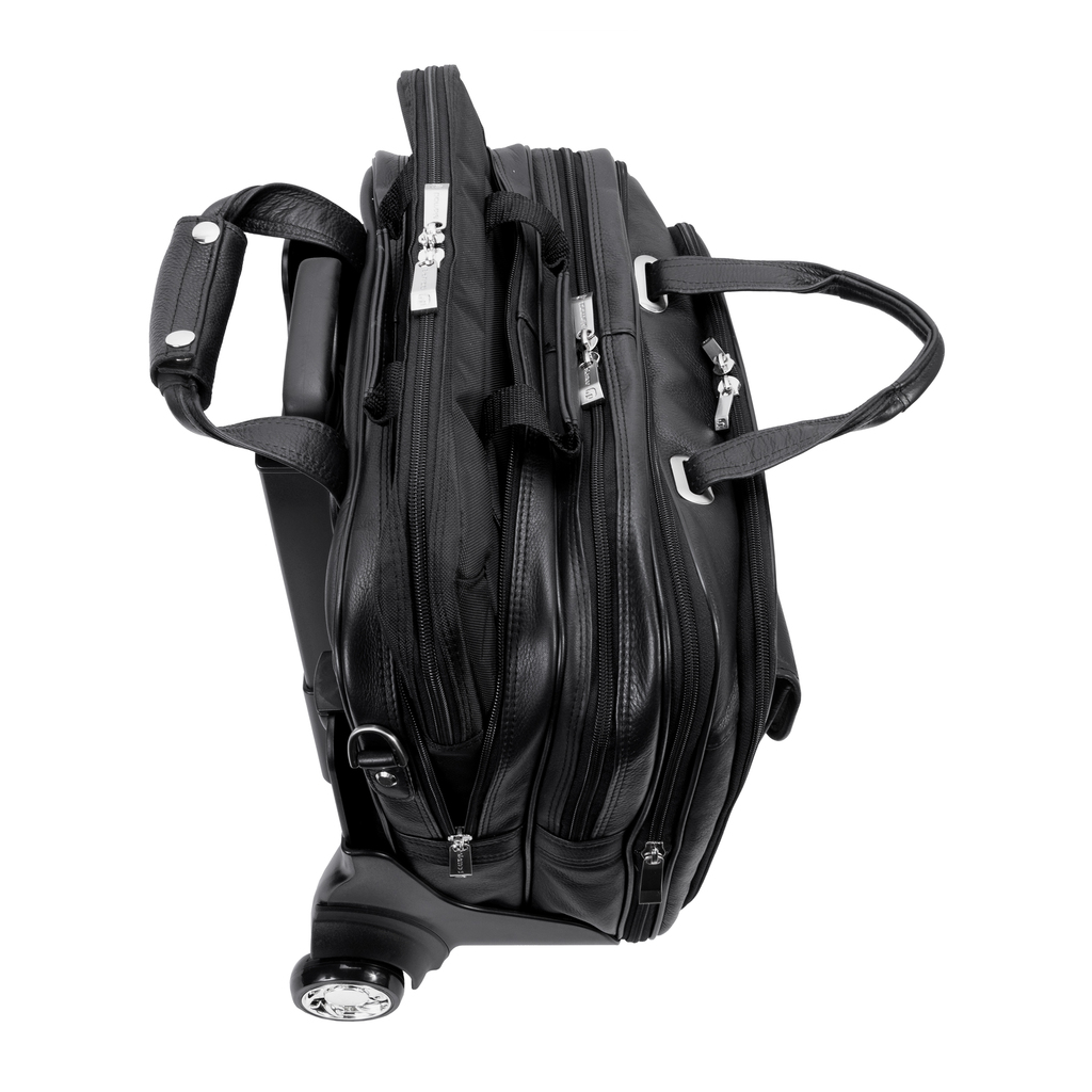 Secure, detachable patent pending Fly-Through Checkpoint-Friendly laptop sleeve design. Patented 2-in-1 Removable Wheel and Handle System. Detachable laptop sleeve can be used as a separate case with detachable shoulder strap design. Laptop sleeve padded with high-density foam fits most laptops 15" in screen size. Weather proof cover included.