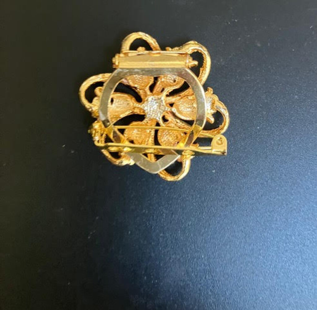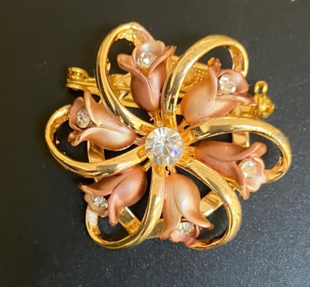 New Coral Tulips With Gold Tone Ribbons; Measures 1 1/2” in Diameter.