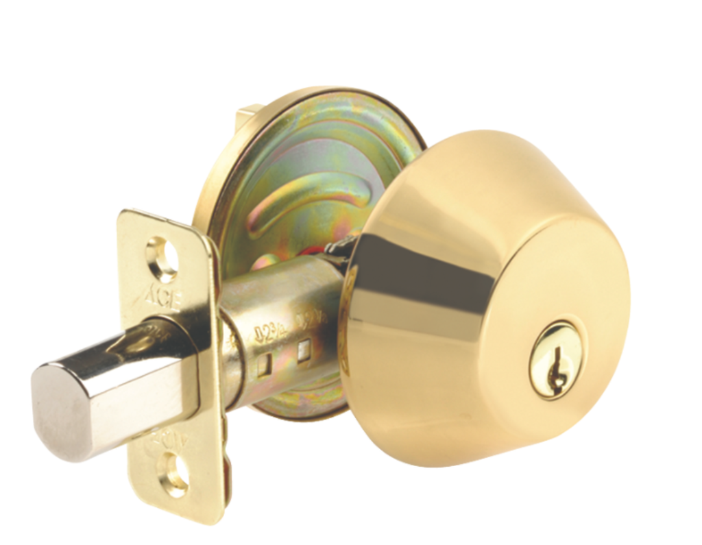 Deadbolt Sgl Cyl Pb Ace is DEADBOLT SGL CYL PB *Brand Name: Ace *Finish: Polished Brass *Material: Solid Brass *Product Type: Single Cylinder Deadbolt *Indoor or Outdoor: Indoor and Outdoor *Height: 19.3 in. *Width: 5.91 in. *Commercial or Residential: Commercial *Minimum Door Thickness: 1-3/8 in. *Compatible Key Numbers: Key No. KW1 *Number of Keys Included: 2 *Maximum Door Thickness: 1-3/4 in. *Door Direction: Left and Right *Grade: 2 Grade *Packaging Type: Clamshell *Bolt Length: 1 in. *Number in Package: 1 pk *Discovery ACC.