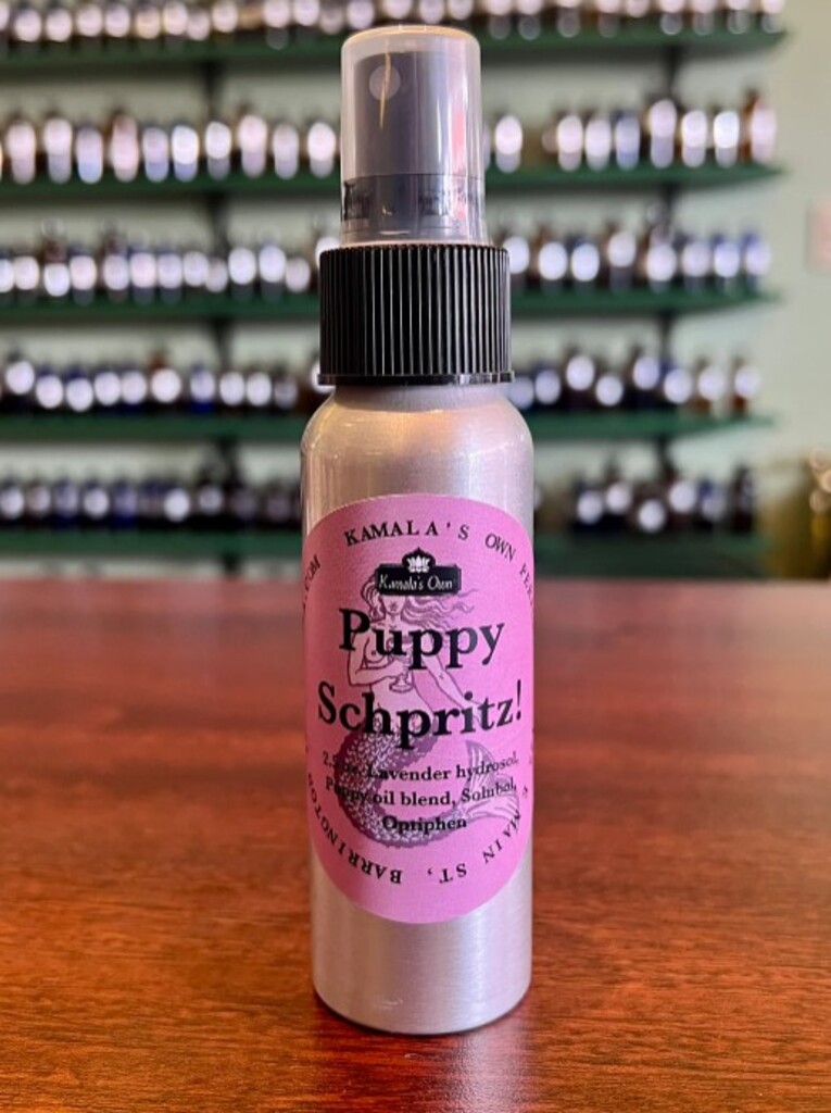 I have had requests for years to make a product for dogs, so here it is! Puppy Schpritz is a blend of essential oils diluted in Lavender water meant to help calm Puppy down when he or she is overexcited. Spray this Schpritz on your dog’s bedding or on the his/her favorite piece of furniture, NOT on the dog.