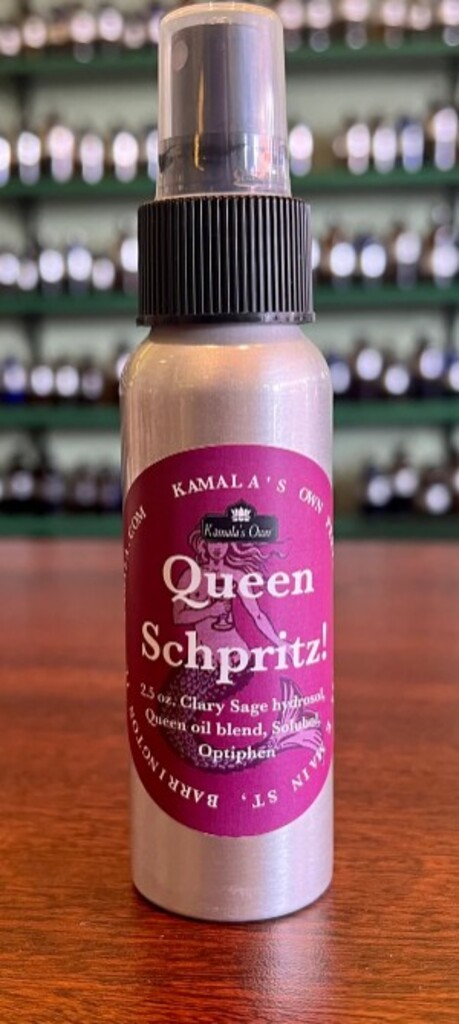 Queen Schpritz is made with Clary Sage hydrosol and my proprietary Queen essential oil blend. It is made to help with the manifestations of menopause. All bodies react differently, so I can't claim that this will have any effect at all, but according to the reports of my customers, this blend can really ease a lot of physical and emotional discomfort. Use it as a linen spray or spray it on your clothing so that you are inhaling its therapeutic scent on a regular basis. Make sure to shake well before spraying and store in the refrigerator for best potency.