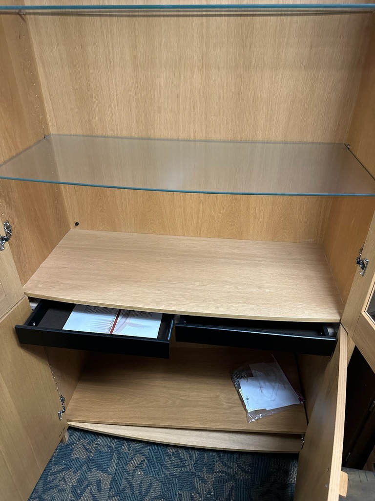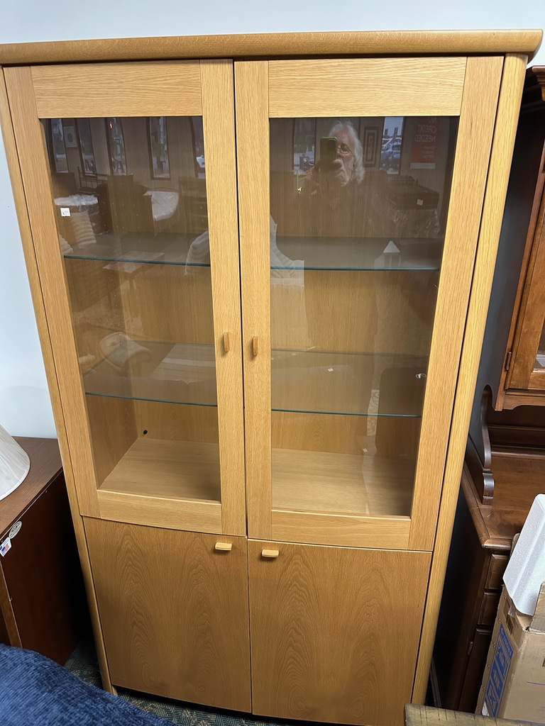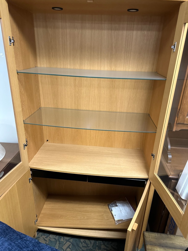 Skovby Dining Room Cabinet- Like New from House of Denmark. Very well made. Dimensions: 46" wide x 77" tall. Has 2 glass shelves, 2 drawers and shelves below. Lights on top.