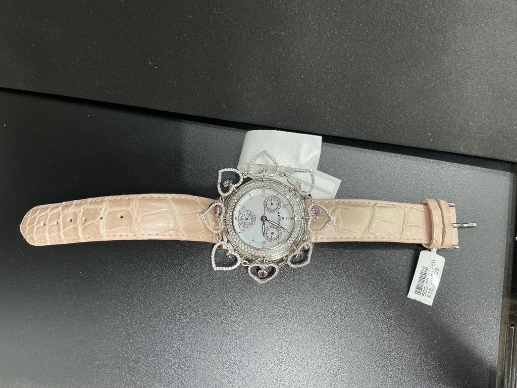Mother of pearl dial Quartz movement with diamonds around the bezel and case Dangle charms in chaos of heart 500-40-21780