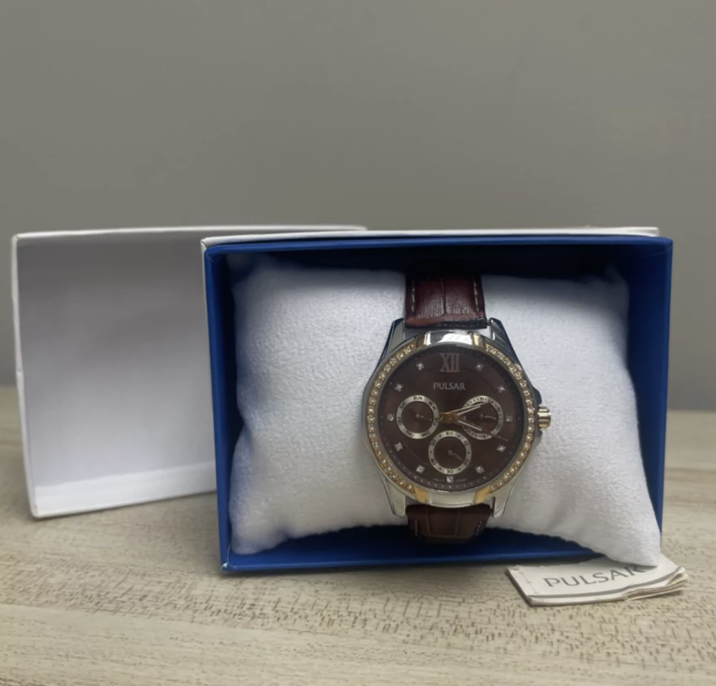 Elevate your style with the Pulsar Women's Watch, featuring a chic brown band adorned with sparkling Swarovski crystals. This stunning timepiece combines elegance and sophistication, making it the perfect accessory for any occasion.