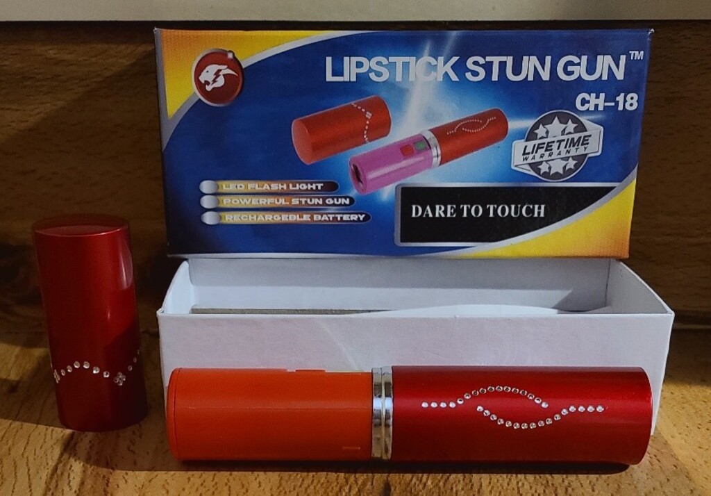 The Lipstick Stun Gun with flashlight is portable and discreet. It packs 4.5 million volts of charge and is powered by a built-in rechargeable battery. Measuring only 5 inches tall and 1 inch round, this unit can fit into most any purse, pocket, backpack or briefcase. Lipstick Stun Gun Features: