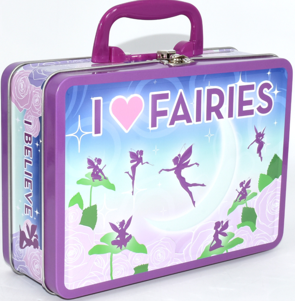Our beautiful I Love Fairies embossed metal lunch box is perfect for your own fan of fairies and Tinkerbell. Artwork shows silhouettes of fairies with magenta trim colors. Features cool retro-style shape.