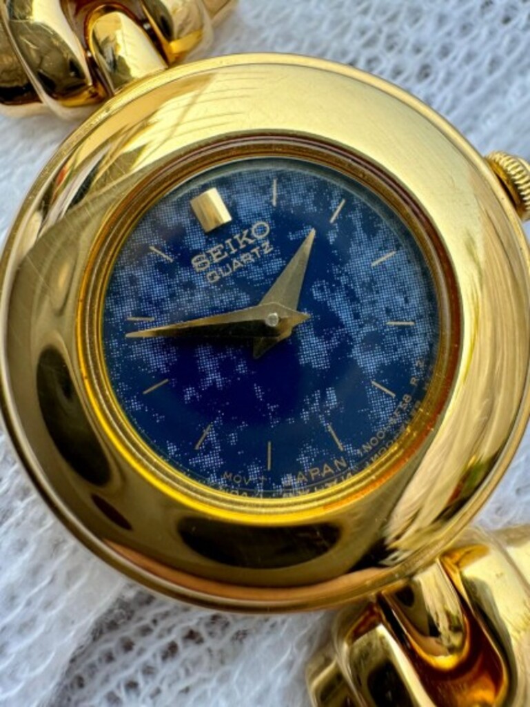 The Seiko SXJM74 is a vintage ladies' quartz wristwatch with a gold-plated case and dark 'opal' dial and a 26mm diameter. It is a vintage model still in original gift box with tags.