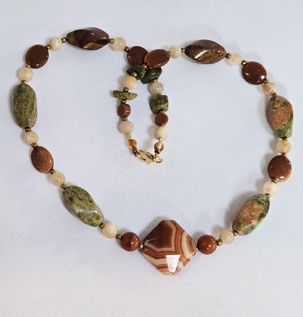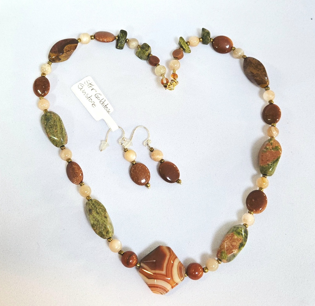 The Focal stone is a gorgeous sardonyx, representing strength, courage, protection and happiness. The secondary foci are unakite, known as a stone of vision, balance and new beginnings. Accent stones are red jasper (strength, protection and vitality), sunstone (positive energy and abundance)and goldstone (ambition and inspiration). 18" with GF lobster clasp. The matching earrings are sunstone and goldstone, about 1.5"