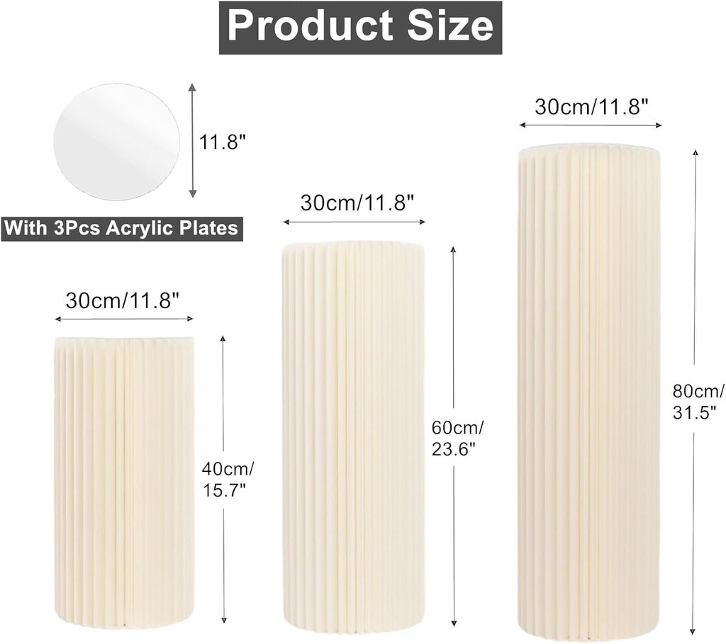 Cylinder Pedestal Stands Set: You'll get 3Pcs cylinder stands measuring 15.7", 23.6", and 31.5" in height, each with a diameter of 12". Along with these, you'll also get 3Pcs acrylic plates of equal diameter.