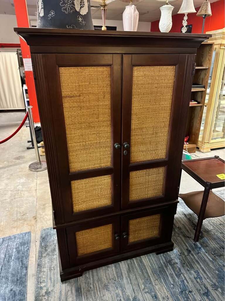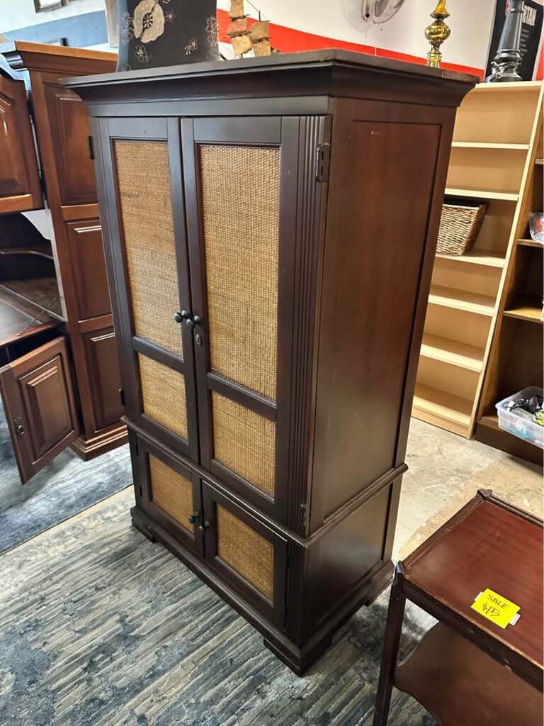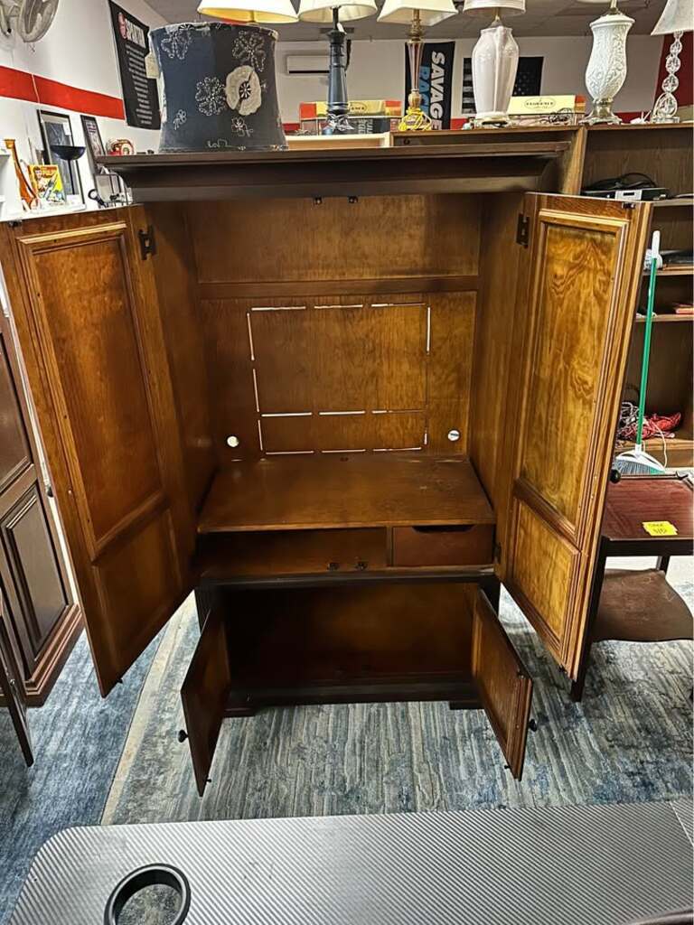 High-quality, heavy, solid wood armoire that can be used as an entertainment center for a TV or as a wardrobe with hanging space. It is a classic, sturdy piece.