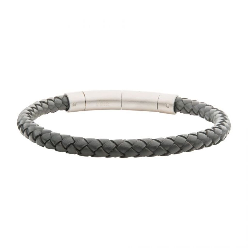 Stainless Steel 6mm Grey Genuine Leather with Brushed Tubular Press Clasp Bracelet. Comes with 1 Self-Adjustable Link. Length: 8.5" - 8" SKU# 801-29