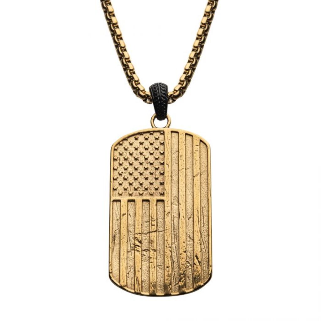 Polished 18K Gold Plated Rugged American Flag Pendant on a High Polished Black Plated Bail with 24 inch long Gold Plated Box Chain SKU#801-048