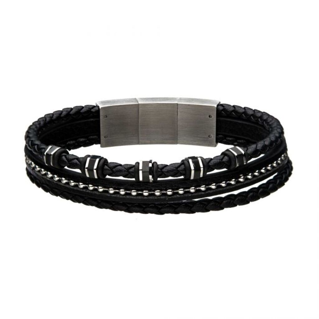 Black Multi Leather with Black & Steel Slide Magnetic Clasp Chains Bracelet. Comes with 1 Self-Adjustable Link. Length: 8.75" - 8.25" SKU# 801-102