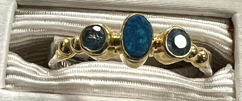 Sterling Silver with Vermeil Accents Bezel Set Opal and Blue Topaz 3 Stone Ring Size 7 SKU#650-471