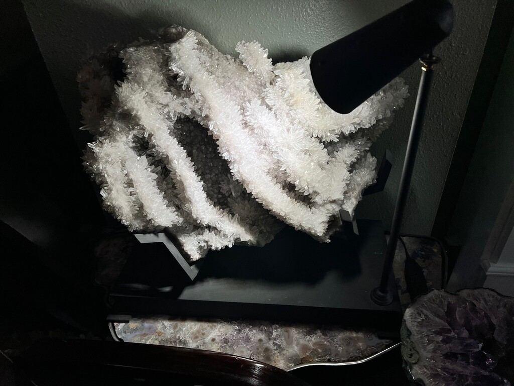 Columbian rare Quartz crystal formation. Rare because the normally form in flat walls. Cones on it’s own hand made forged base with a light.
