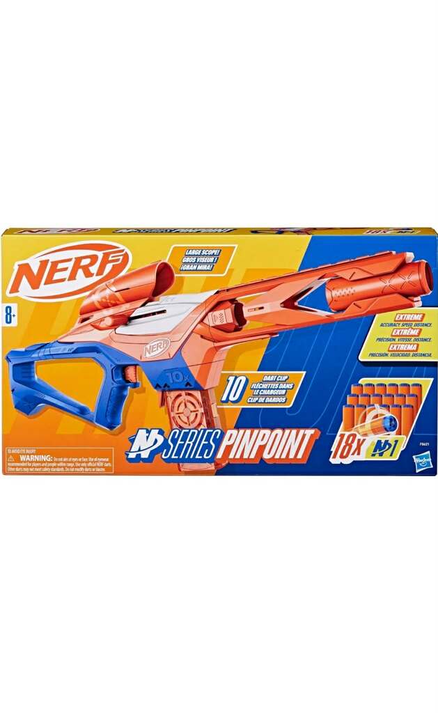 The Nerf N Series Pinpoint blaster is a manual bolt-action rifle designed for "extreme accuracy" and long-distance play, featuring a built-in scope and 10-dart magazine. It uses exclusive N1 darts, firing around 90 FPS. The blaster is styled as a sniper-class weapon, suitable for ages 8 and up