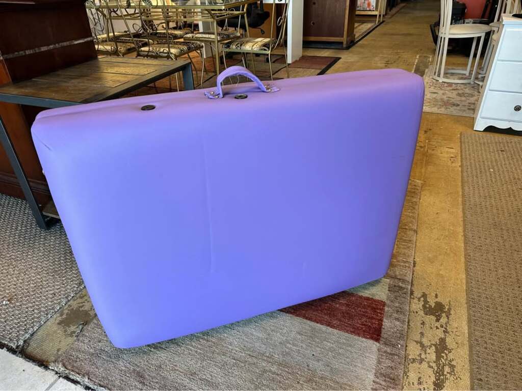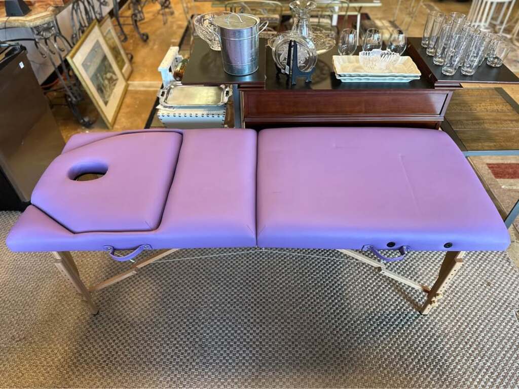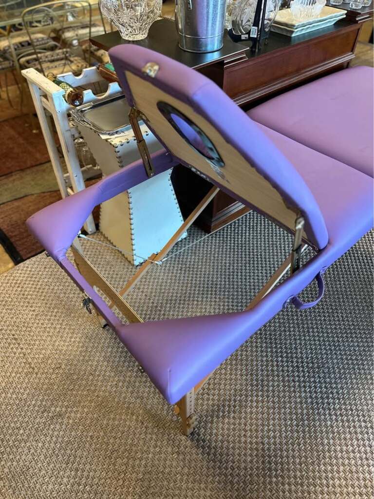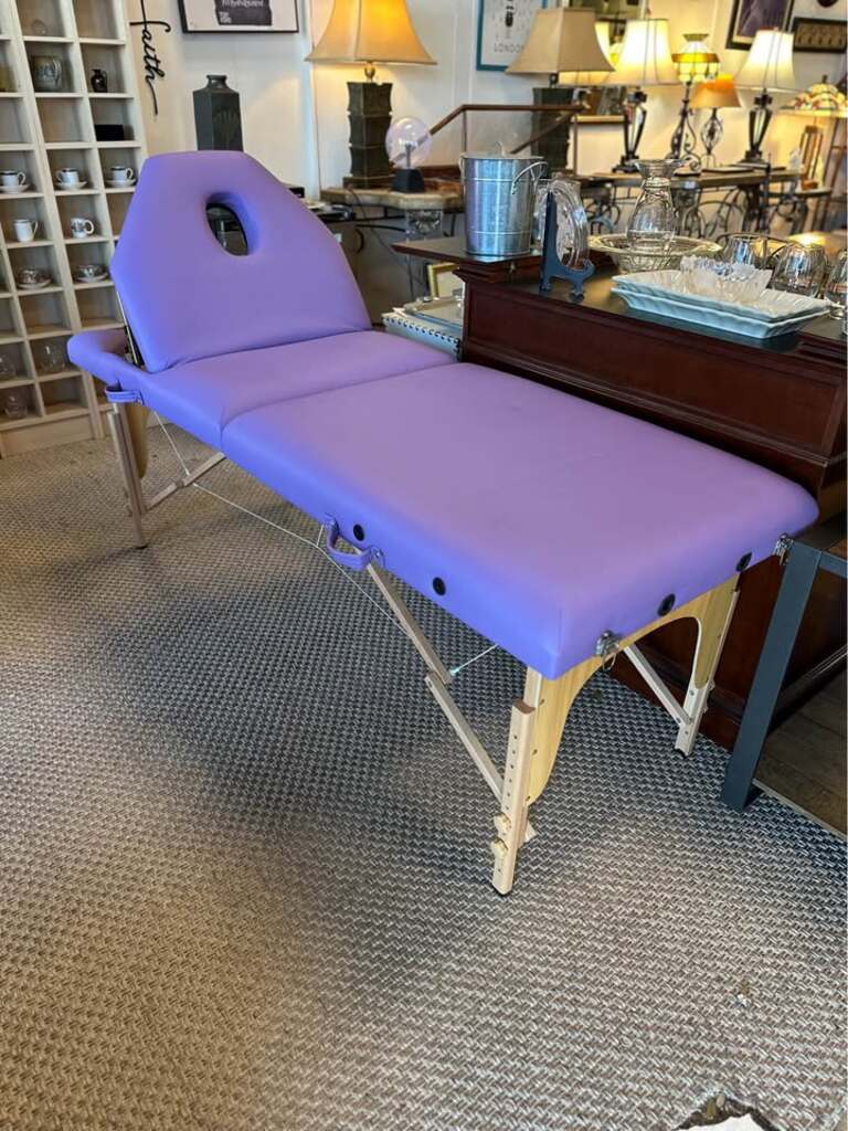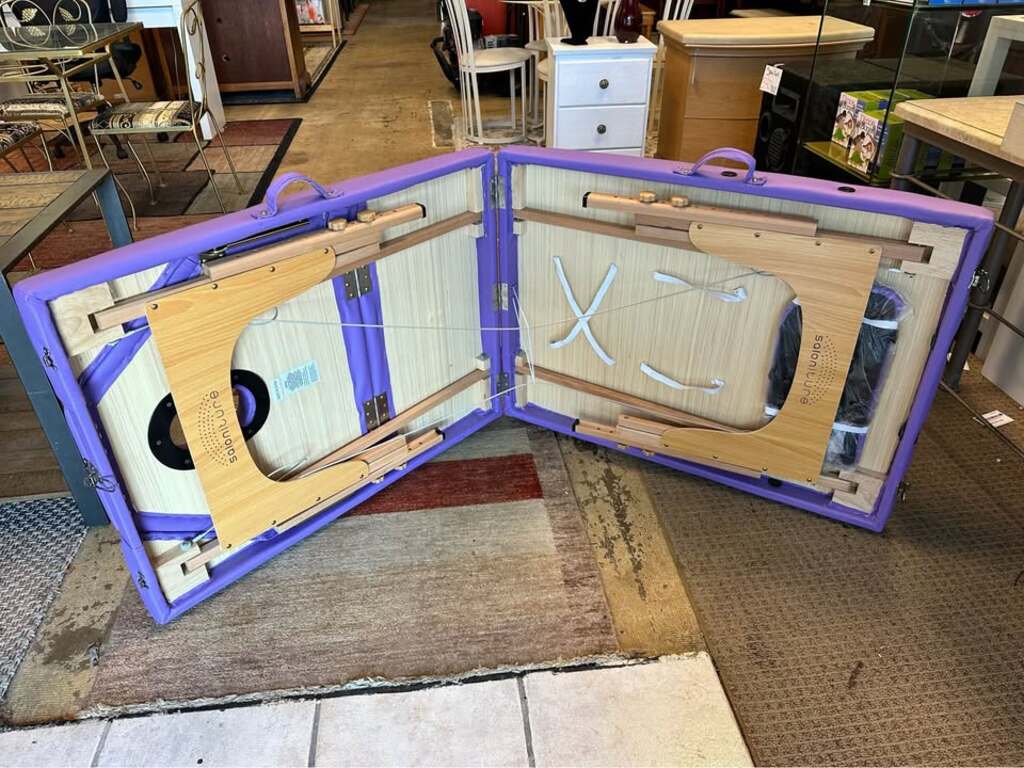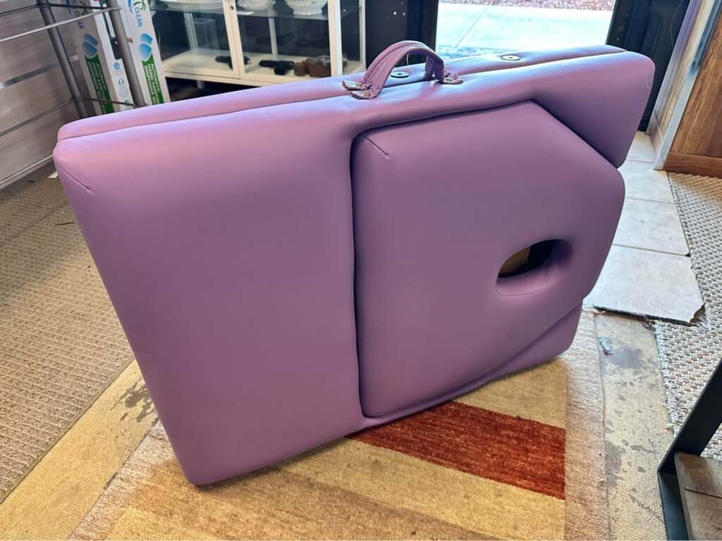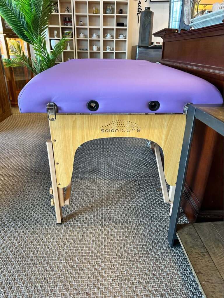 Portable Salonture massage table. Purple color. Foldable design with a handle, easy to carry. Has a face cradle opening. Adjustable wooden legs.