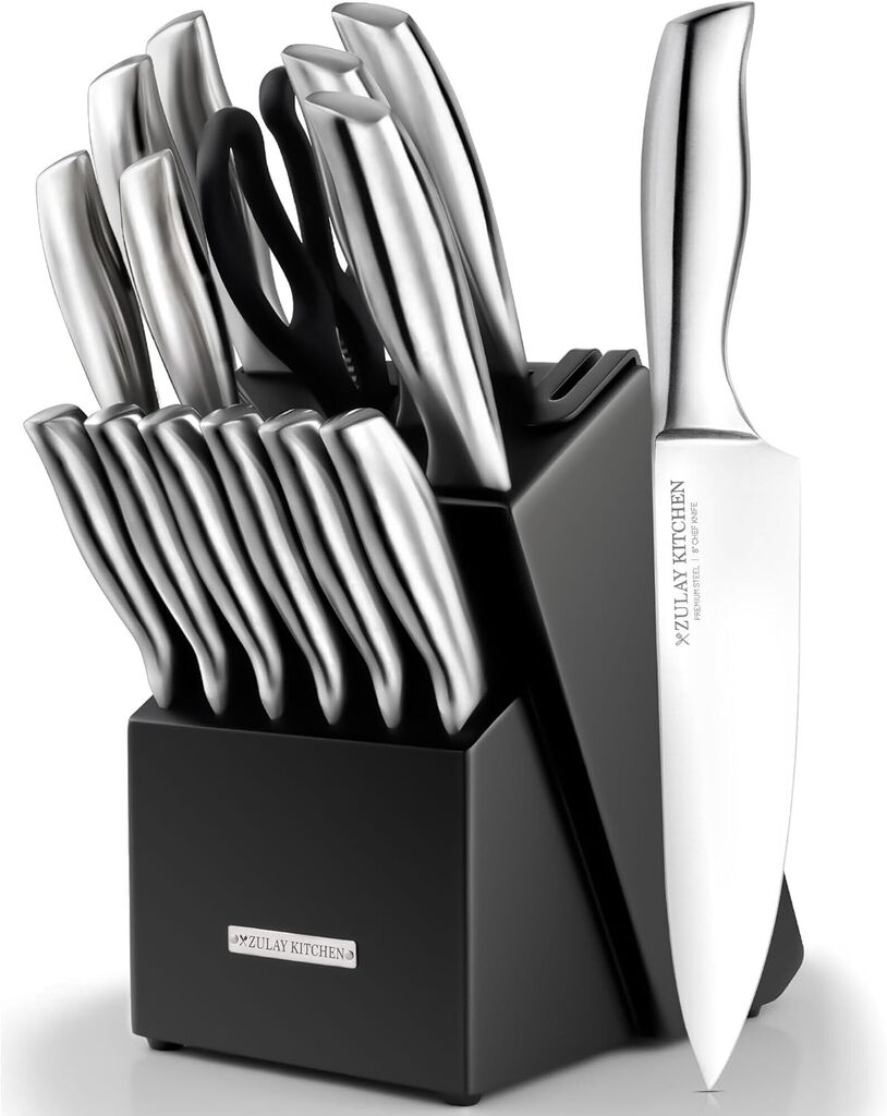 Our 15-piece Stainless Steel Knife Block Set is expertly crafted from high-quality stainless steel, known for its exceptional sharpness, durability, and resistance to rust and corrosion. Each knife is precision-forged to ensure long-lasting performance in the kitchen, whether you're slicing meats, chopping vegetables, or dicing herbs. This comprehensive kitchen knife set includes everything you need for efficient meal preparation: a stylish natural wood knife block, 6 steak knives for elegant dining, 2 versatile chef knives for all-purpose cutting, a santoku knife for precise slicing, a bread knife with serrated edges for effortless slicing, a slicing knife for thin cuts, a serrated utility knife for tough-skinned fruits and vegetables, a paring knife for intricate tasks, and reliable kitchen scissors.