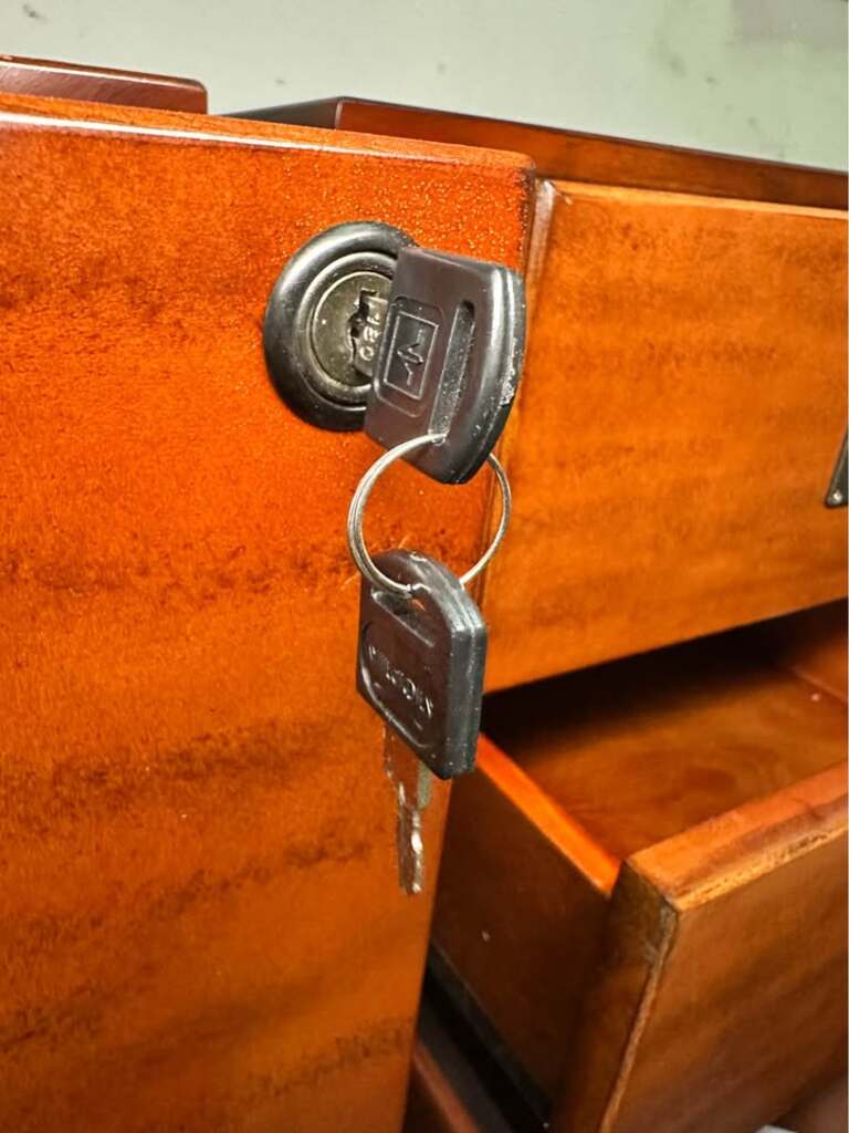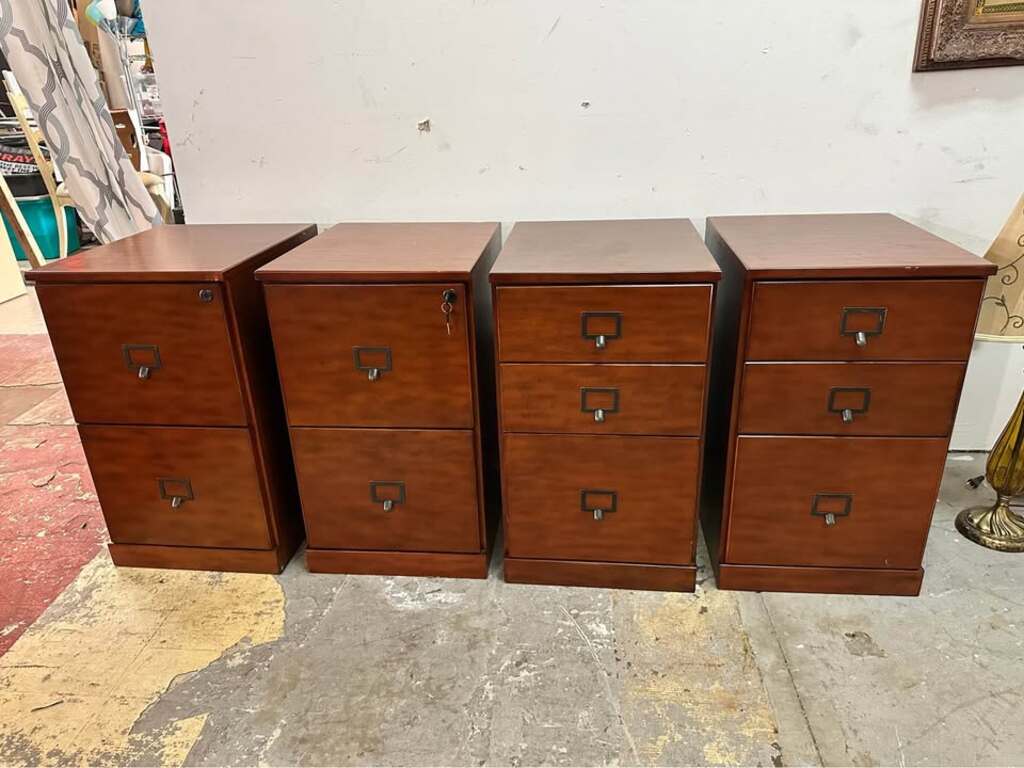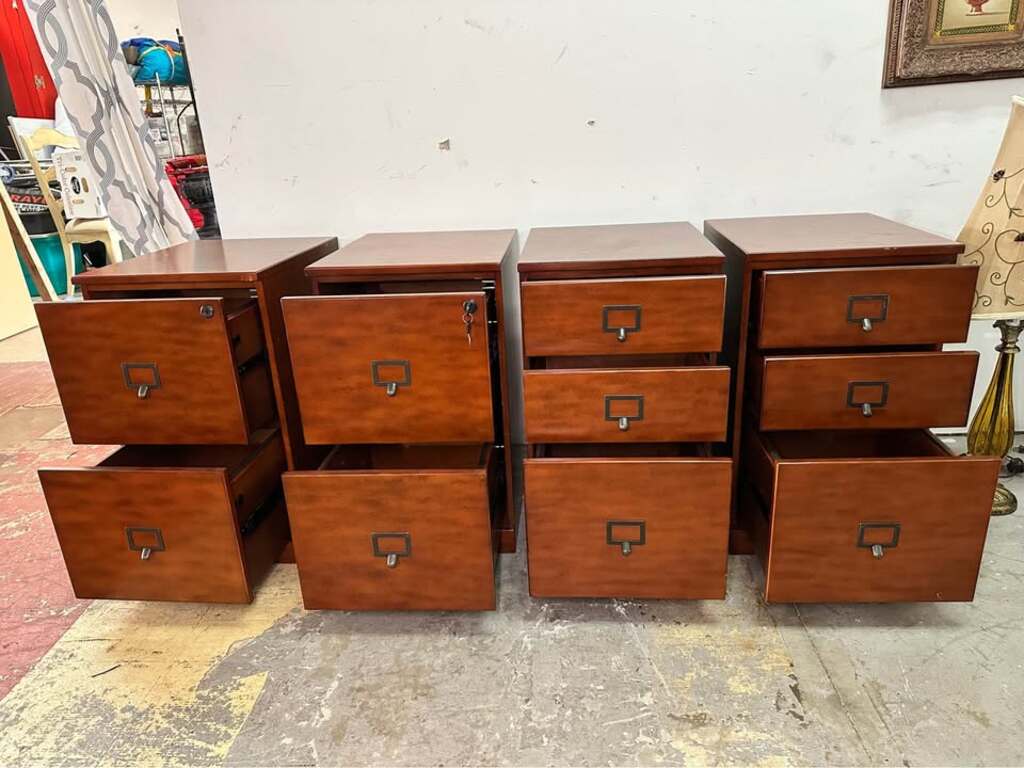 Functional wood filing cabinets for sale. Got a few of these, 2 of the filing cabinets lock(comes with keys). Nice brown wood finish with metal label holder handles. Great for office or home storage.