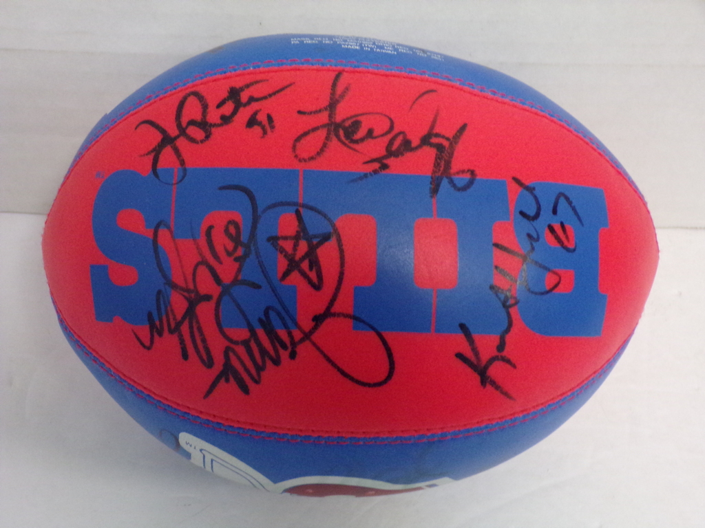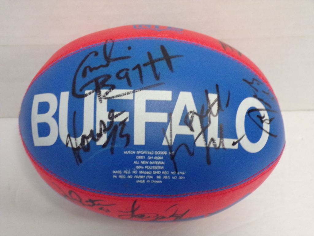 Signed by 13 Buffalo Bills players including Thurman Thomas, Bruce Smith, Cornelius Bennett, Frank Reich, Howard Ballard, Don Beebe, James Lofton, Leon Seals, Jim Ritcher, and Nate Odomes! 100% authentic. Comes with a Certificate of Authenticity and a lifetime money-back guarantee. Please see the photographs provided to review your item in detail. The ball is a soft, squishy toy and measures 7" in length. Packed with care.