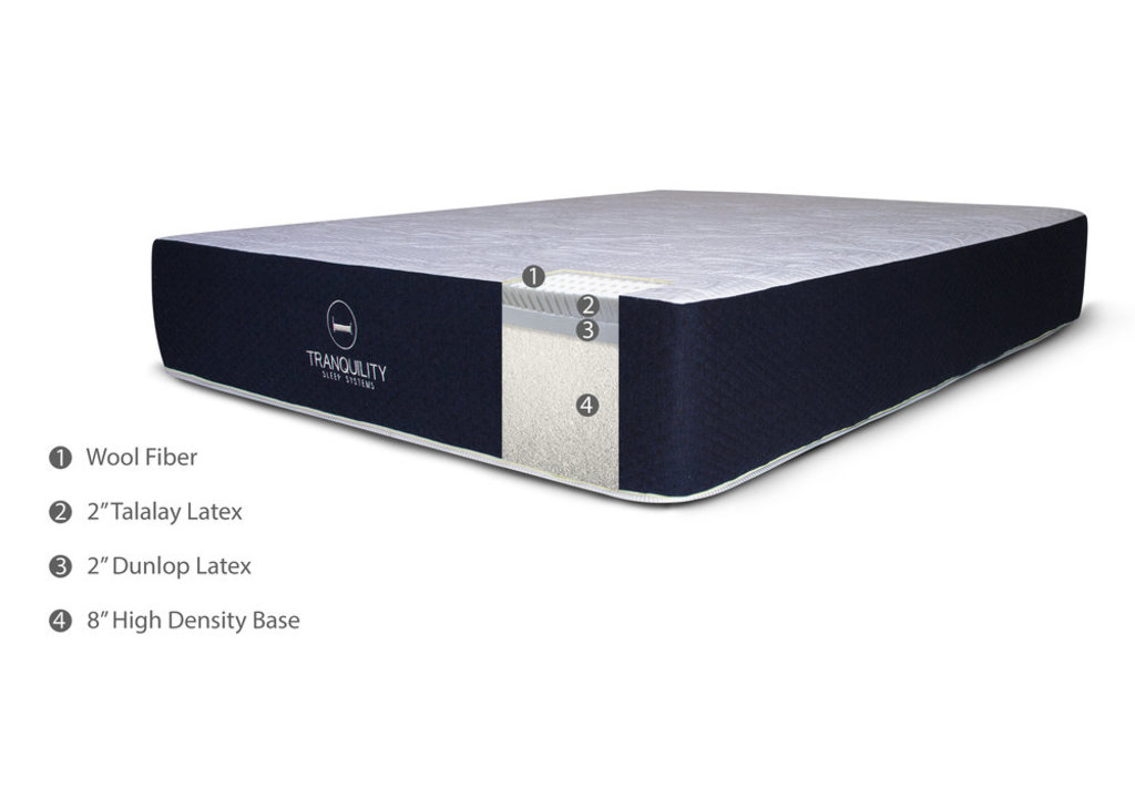 The latex foam in this luxurious bed give you a great "sleep on it" feel while never giving you an issue of rolling over in bed! This deluxe version provides maximum air flow and comfort. The bed's expert craftsmanship begins with our soft, extravagant wool fiber comfort top that envelops a full 2-inch layer of latex foam plus another 2-inch layer of Dunlop latex foam. An 8-inch high-density foam core base support system is at the heart of this exceptional sleep experience. keeps you resting easy in this exceptional bed. Tranquility at its best.